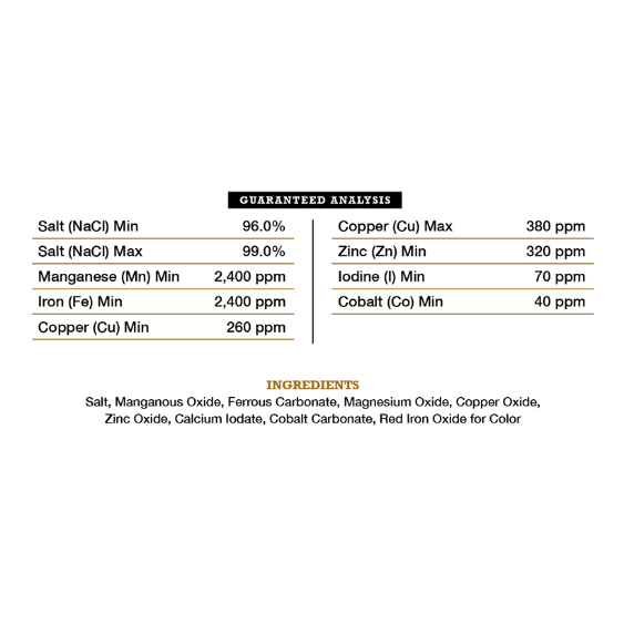 Salt, Manganous Oxide, Ferrous Carbonate, Magnesium Oxide, Copper Oxide, Zinc Oxide, Calcium Iodate, Cobalt Carbonate, Red Iron Oxide for color