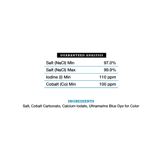 Cobalt is important for Vitamin B12 synthesis, which is essential for thermoregulation, appetite stimulation and normal protein, carbohydrate and mineral metabolism. This feed salt product helps prevent the types of mineral deficiencies that can lead to low conception rates, abortions and weak calves. It's appropriate for all classes of beef and dairy cattle, sheep, pigs and horses.